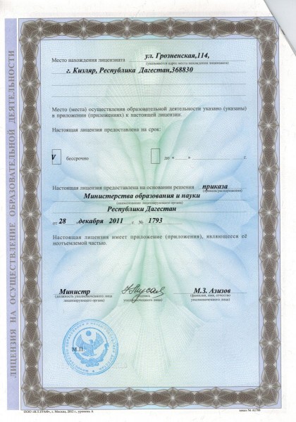 | Адрес местонахождения образовательной организации* | 368830, Республика Дагестан, г. Кизляр, ул. Грозненская, 114 |